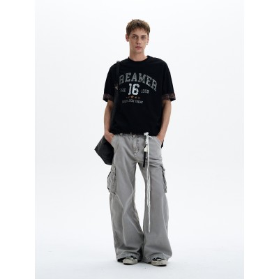 レトロヴィンテージレタープリントTシャツ。メンズカジュアル万能デザイン。パッチワークチェック柄半袖。