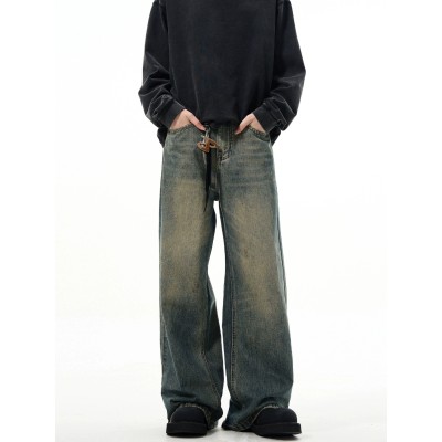 アメリカンスタイルのクリーンフィットカジュアルストレートレッグワイドレッグジーンズ、メンズ、レトロヴィンテージルーズパンツ