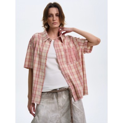 男性と女性のためのテクスチャチェック柄半袖シャツ、ゆったりとしたカジュアルなヴィンテージカップルトップジャケットイン