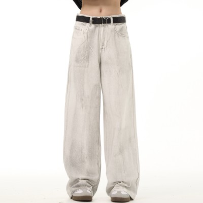 アメリカンレトロなダメージ加工デザインフロアレングスジーンズ、ニッチなハイストリートのゆったりとした万能ワイドレッグパンツ